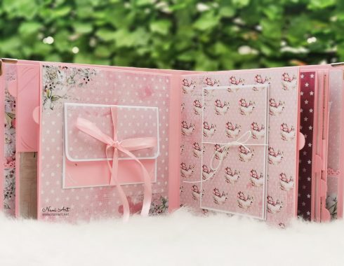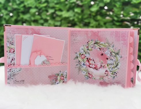 Албумчето е с размер 21 х 21 см., съдържа 14 страници с интересни разгъвки, джобчета, тагчета и място за надписване. Изработено е в нежени цветове с прекрасните дизайнерски хартии на Craft Land. Събира до 60 снимки с размер 10 х 15 см.
